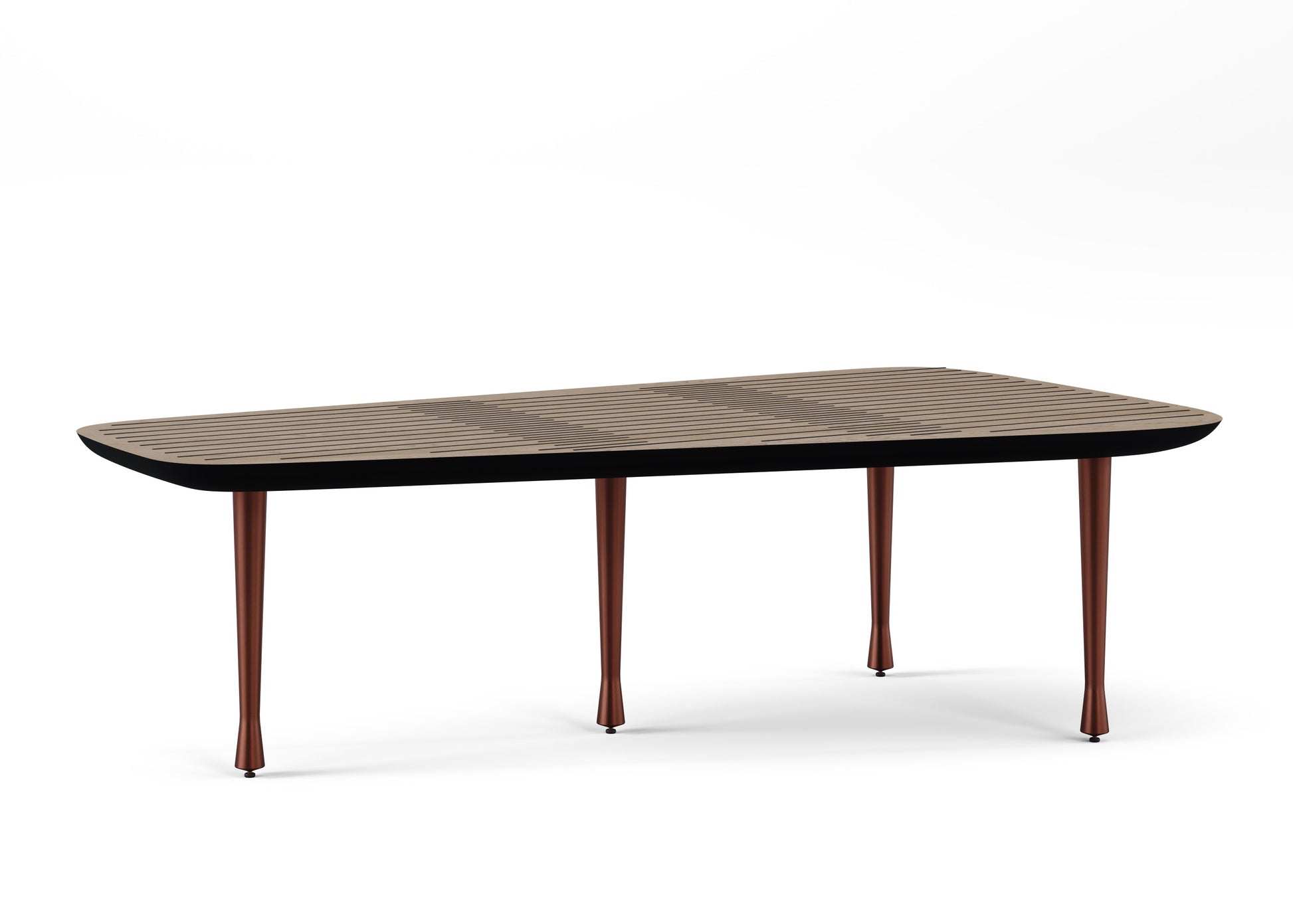 We raise the bar for cofee table designs by just a little bit, with the high variant of the Fifties Cofee Table. The top is detailed with the same geometric printed veneer that graces the Fifties Dining and Low Cofee Tables, but this time, it gloriously highlights the table’s unique asymmetric approach. Doing away with straight lines, the Fifties High is wide at one end and tapers delightfully towards the other, accentuated by the placement of the beautiful high rose gold legs that simply ooze glamour and whimsy.