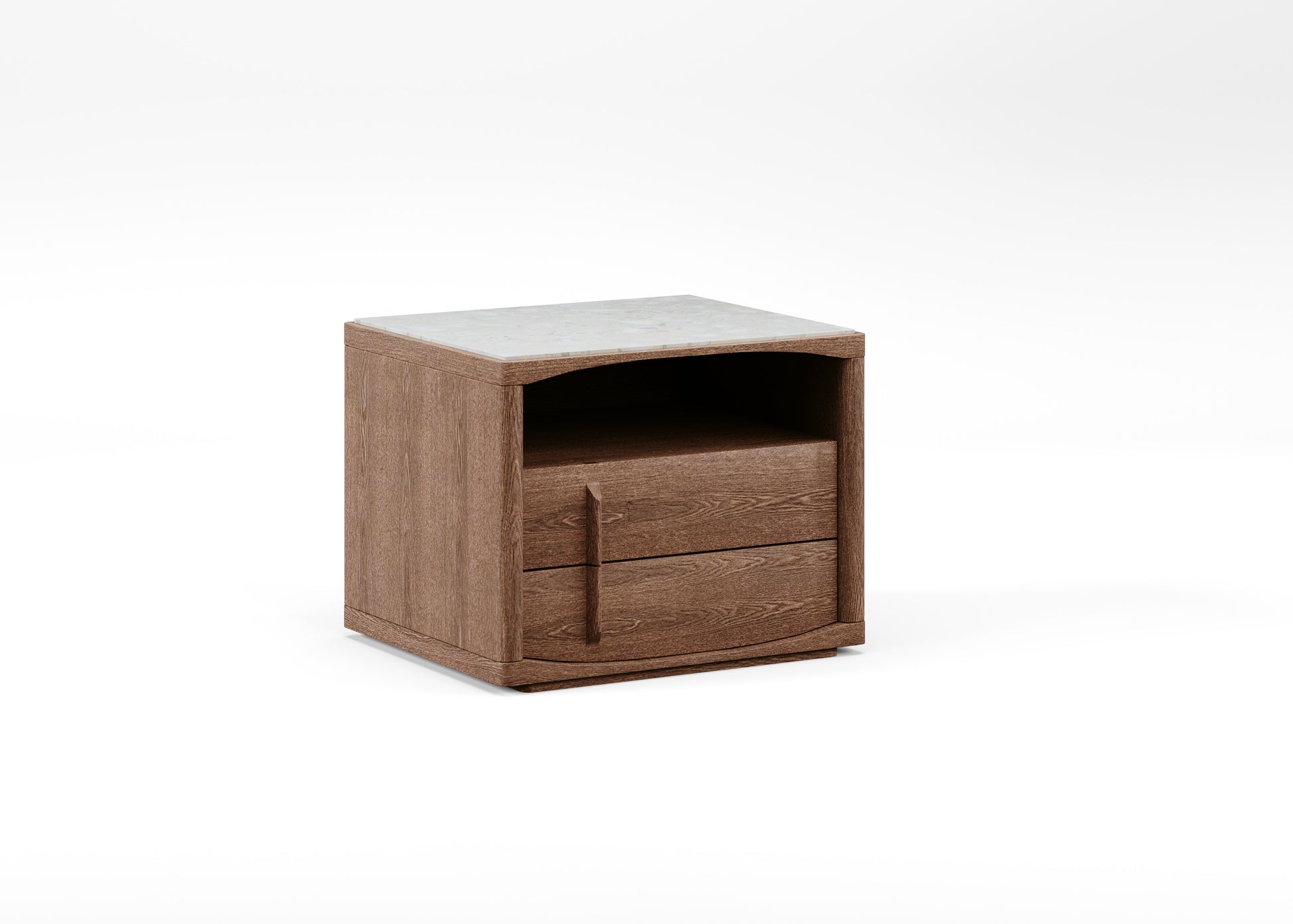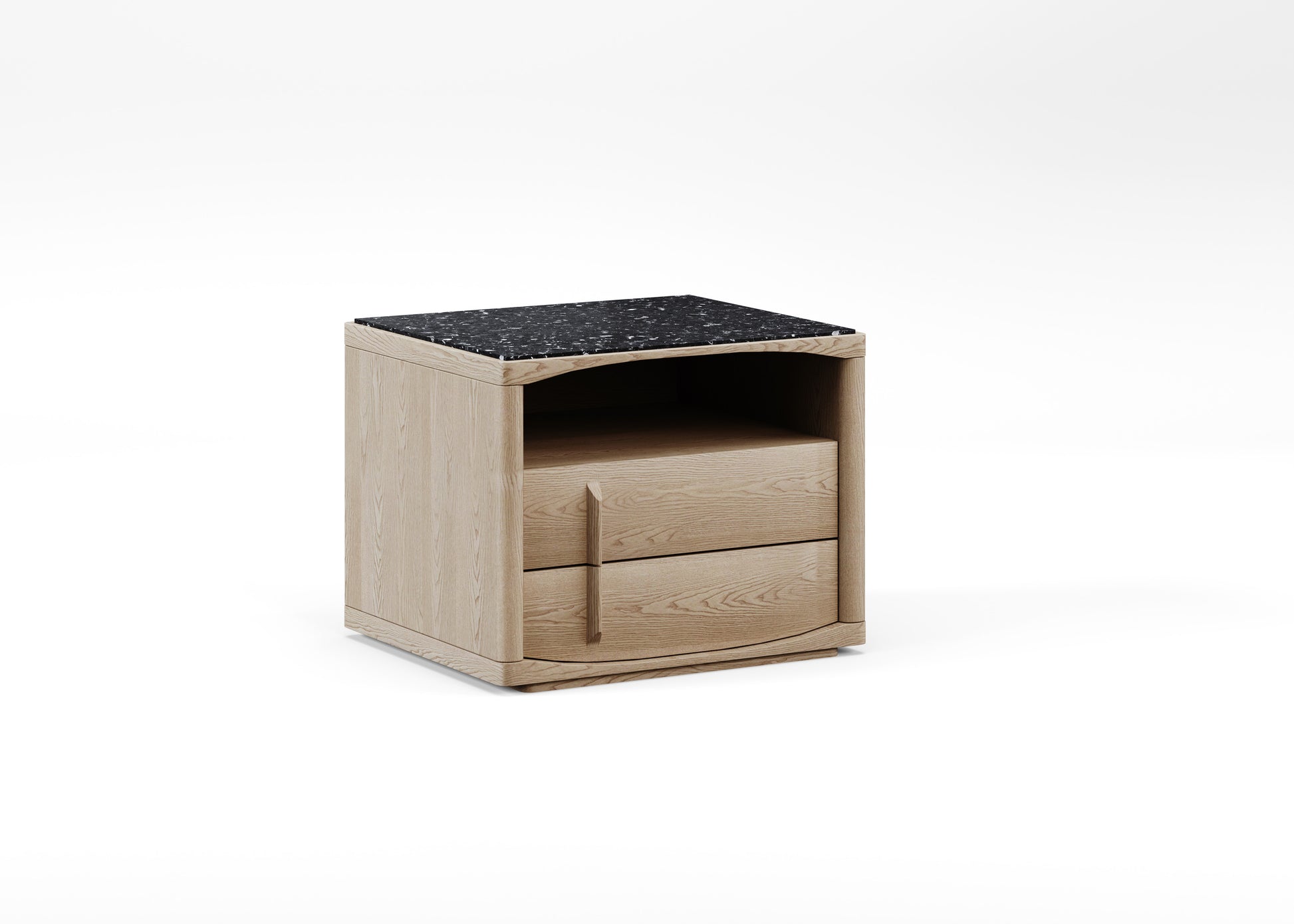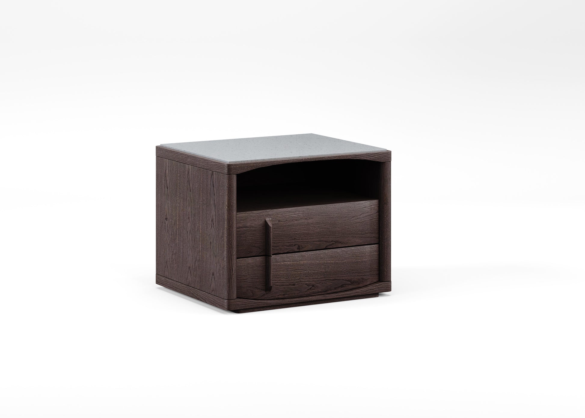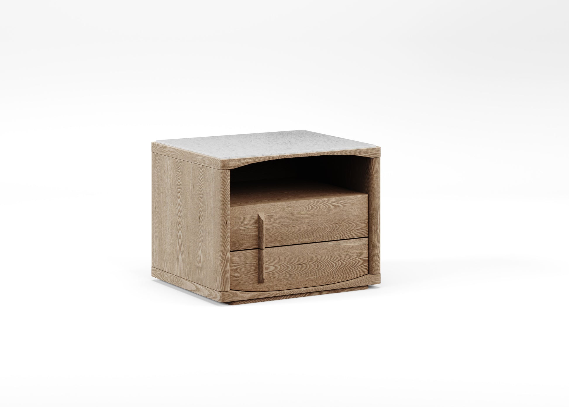 Built primarily out of wood and stone, the Harper Night Table is the perfect bedside companion. An eye-catching cavity accompanies its two snug, sleek drawers, ofering a wealth of storage space to go with the understated elegance of its beautiful ash crown veneer. Crowned with an exquisite terrazzo or quartz top for an added flair, this bedside table is truly hard to resist.