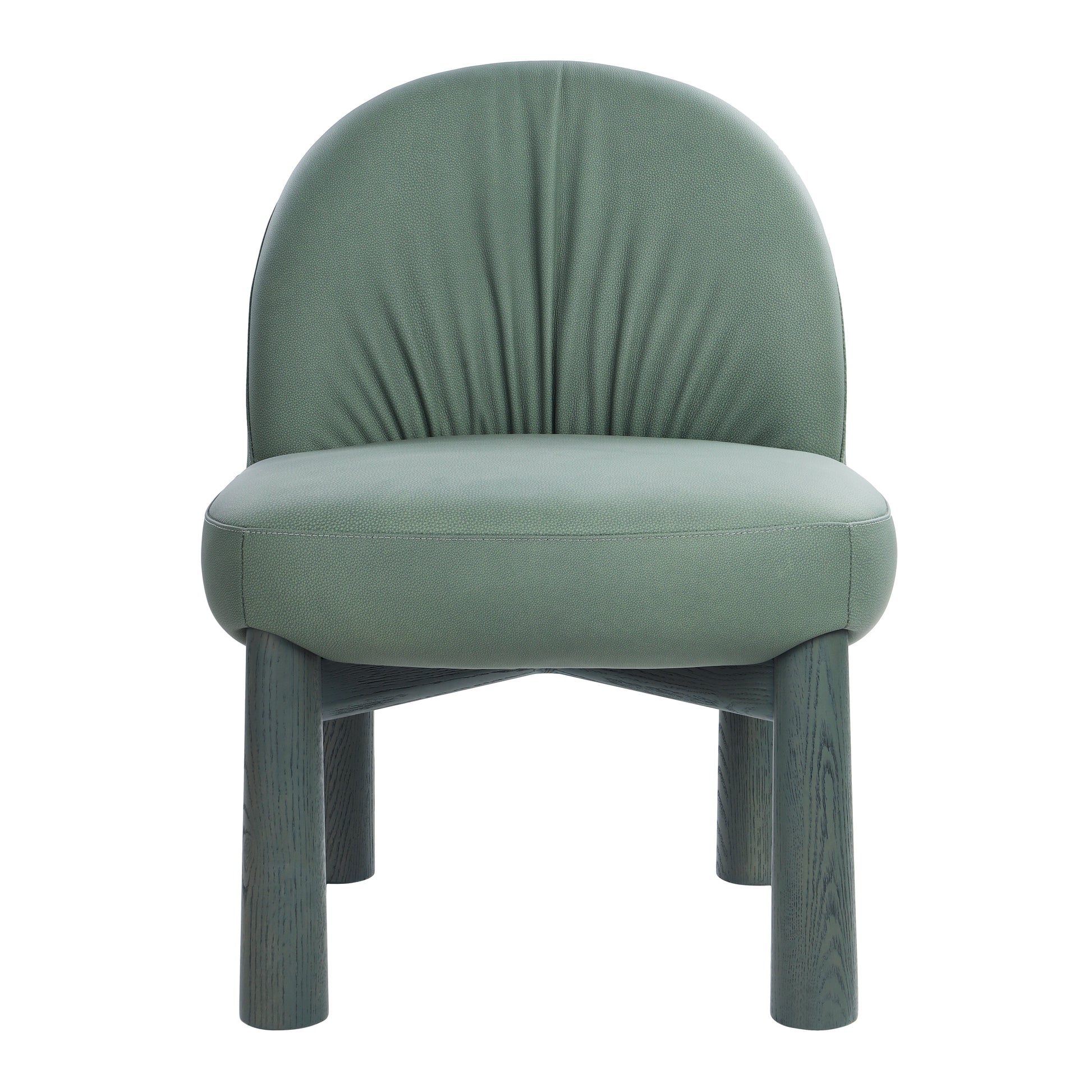 The Nara Chair features a plush, rounded back available in luxurious upholstery options from SUNDAY Design; creating a welcoming and cozy seating experience. The generous seating area complements the curved silhouette, while the sturdy legs, finished in a matching wood tone, offer a grounded, nature-inspired contrast. The gentle pleating of the upholstery adds texture and visual interest, making this piece an inviting addition to any living room, lounge, or creative workspace. Its elegant, playful design embodies modern sophistication while ensuring comfort.