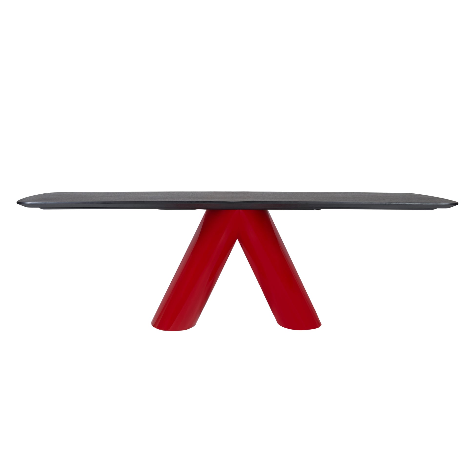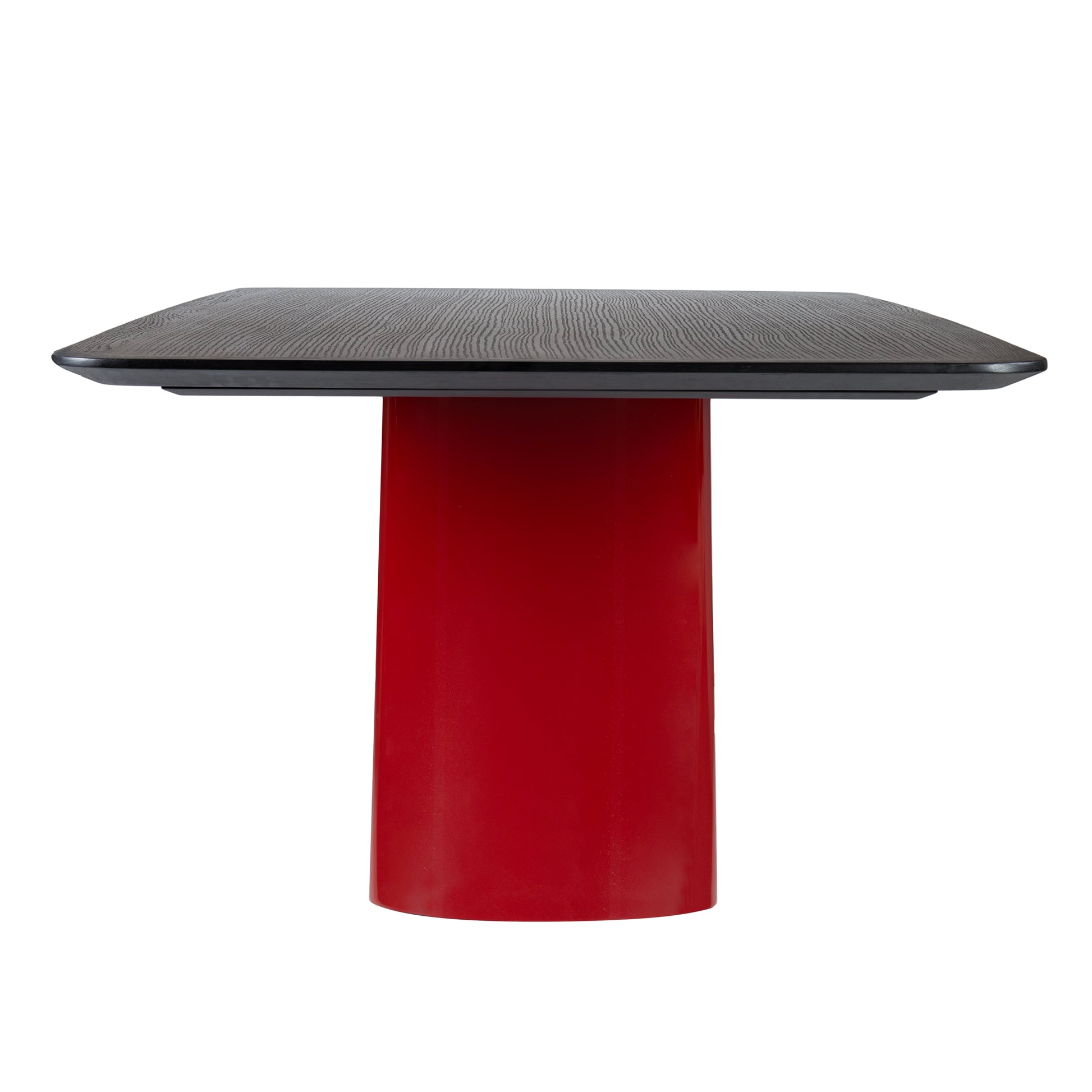The PIVOT dining table blends a sleek wooden top with bold red cylindrical legs, creating