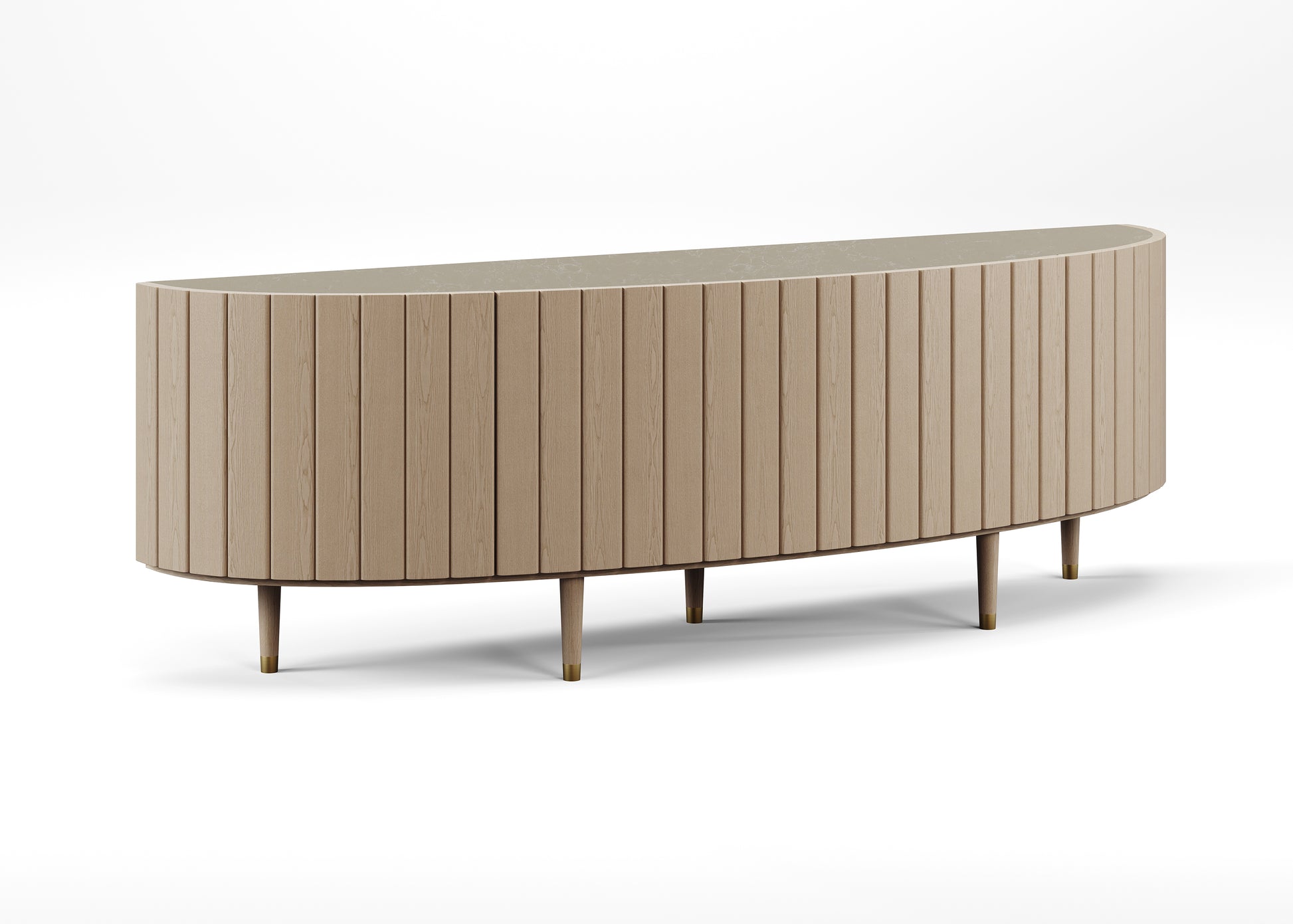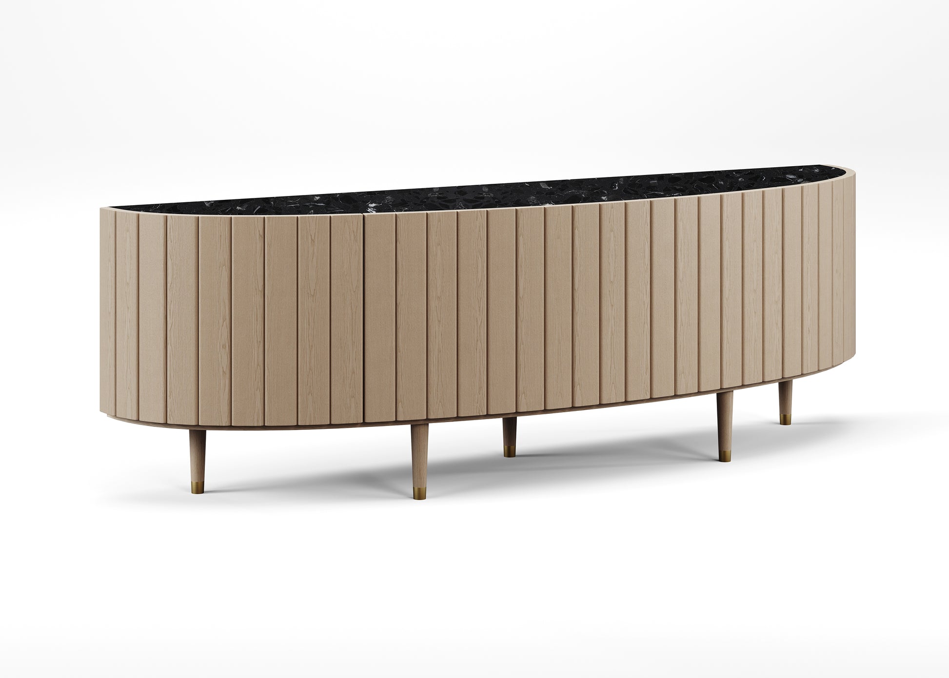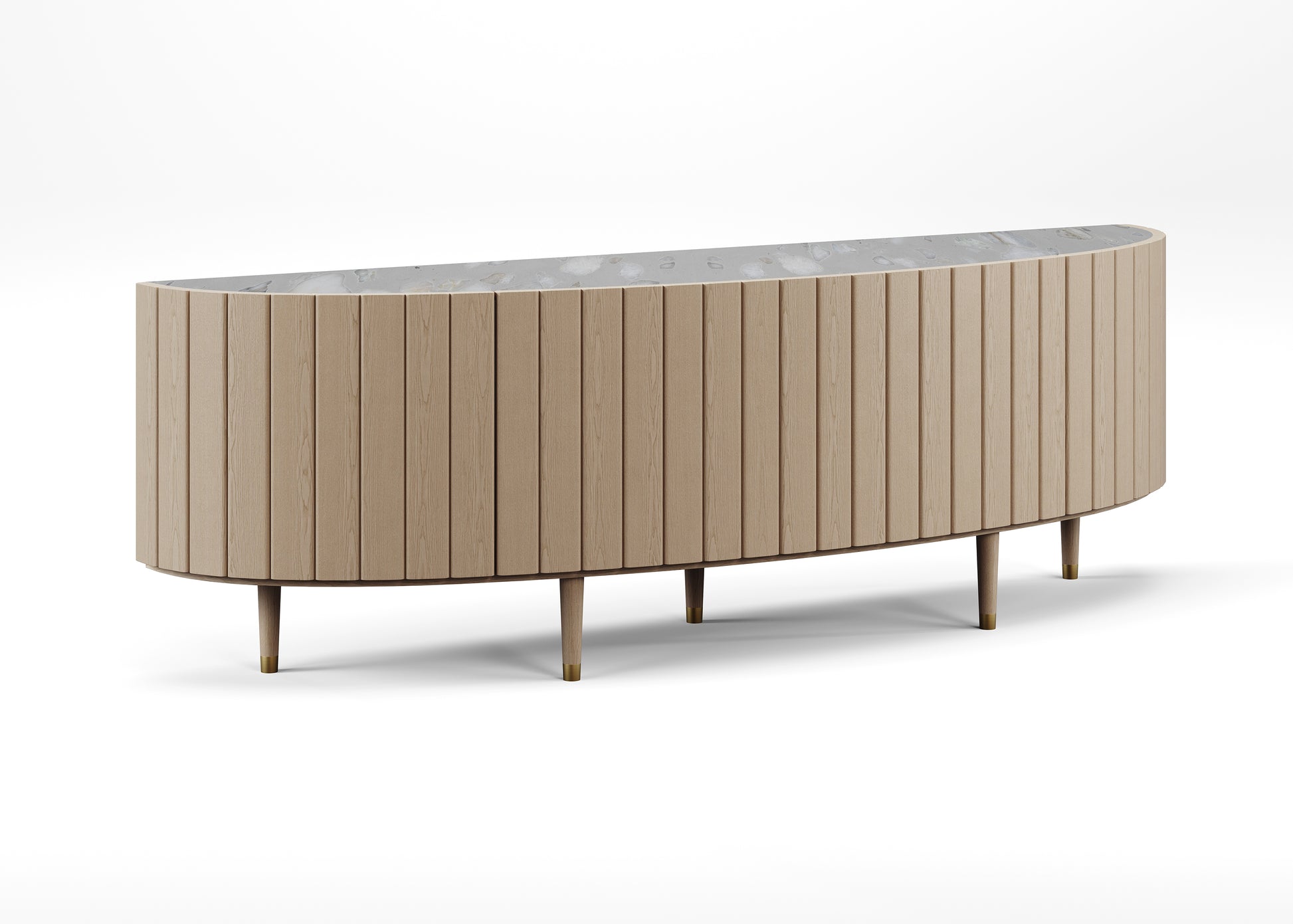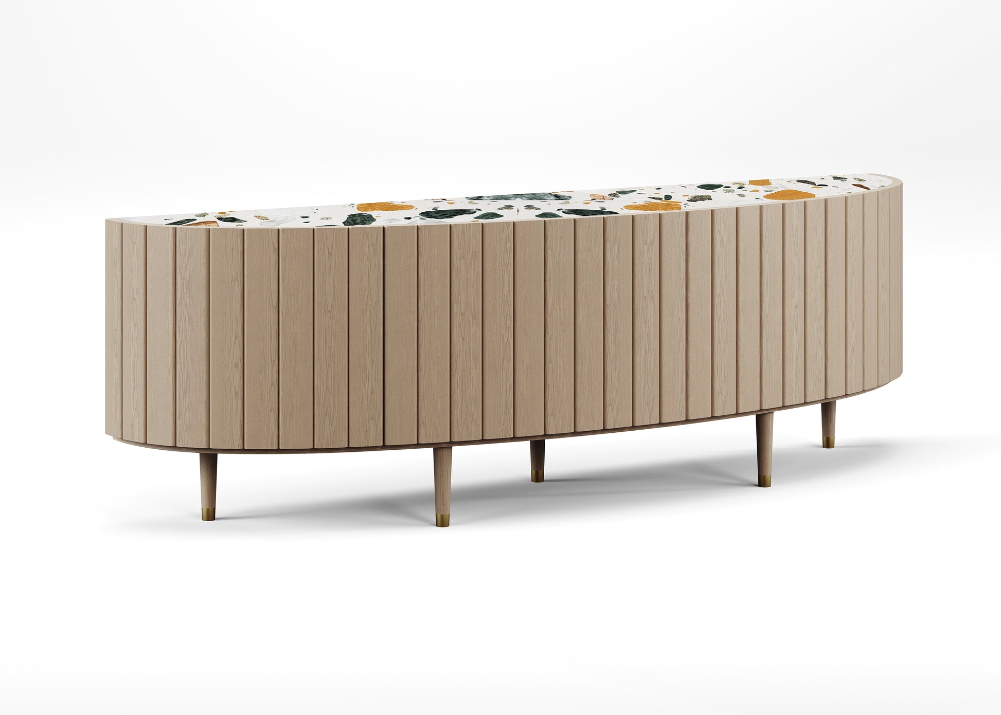 A playful creativity imbues every fbre of the Sparks low cabinet. Beautifully rounded wooden legs ofset from each other prop up its gorgeous, curvilinear form that strikes the perfect balance between style and subtlety with effortless ease. The fnely ridged exterior cleverly doubles as a pull, revealing bountiful amounts of storage space beyond. Topped of with an exquisite terrazzo platform, the Sparks is a refreshing departure from the monotony of regular postmodern living room furniture design. Topped of with an exquisite stone platform, the Sparks is a refreshing departure from the monotony of regular post modern living room furniture design.